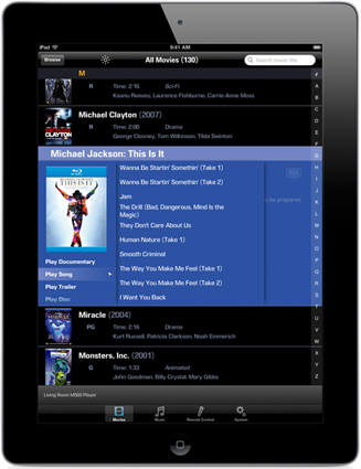 The Kaleidescape System lets you quickly select and play any album or track with an intuitive on screen graphical user interface or list option., or alternatively via the screen of your touchscreen controller such as IPad, IPod or other touchscreen device.